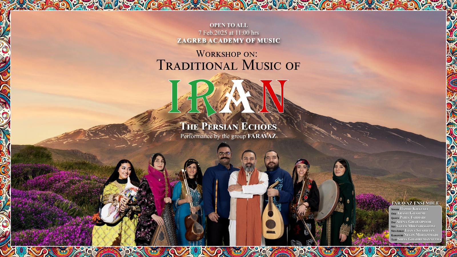 Muzička će akademija u Zagrebu 7. veljače 2025. godine u sklopu glazbene radionice ugostiti profesionalne glazbenike iz Irana koji će studentima i široj javnosti predstaviti tradicionalna iranska glazbala. Osmeročlana skupina izvest će nekoliko djela koja će dočarati tradicionalnu iransku glazbu i pokazati umijeće pjevanja i sviranja na iranskim instrumentima kao što su Taar , Kamancheh , Qanun , Oud , Ney-anban , Ney itd. Skupina će prisutnima objasniti upotrebu instrumenata, njihovu povijest i složene načine izvođenja koji su kroz dugu perzijsku povijesti ostali očuvani do danas.