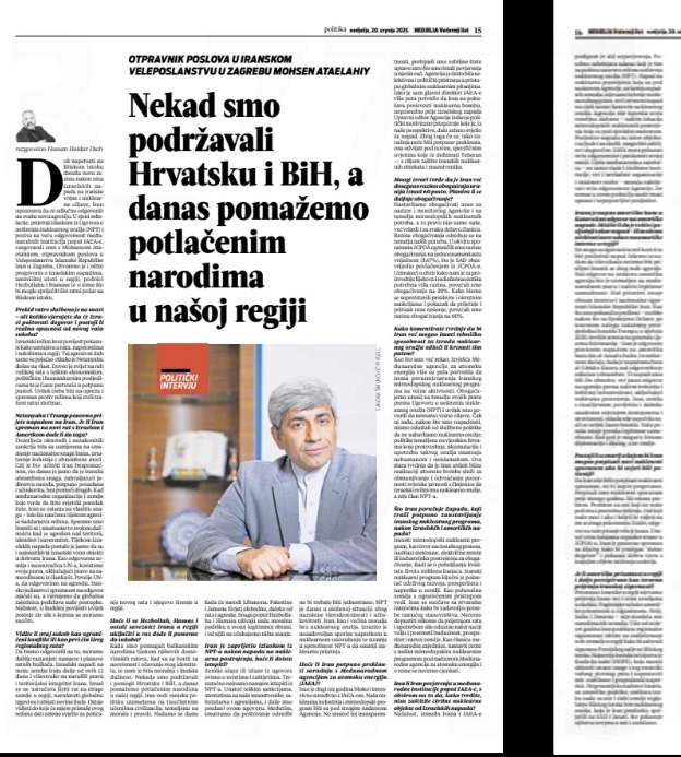 ایران همزمان با اوج‌گیری تنش‌ها در خاورمیانه پس از یک سری حملات اسرائیل به اهداف نظامی و هسته‌ای ایران، هشدار می‌دهد که به هرگونه تجاوز جدید قاطعانه پاسخ خواهد داد. در سایه تشدید تنش‌ها، تهدیدها برای خروج از پیمان منع گسترش سلاح‌های هسته‌ای (NPT) و درخواست‌ها برای پاسخگویی بیشتر از سوی نهادهای بین‌المللی مانند آژانس بین‌المللی انرژی اتمی، ما با محسن عطاالهی، کاردار سفارت جمهوری اسلامی ایران در زاگرب، مصاحبه کردیم. او آشکارا و با لحنی تند درباره حملات اسرائیل، نقش آمریکا در منطقه، حمایت از حزب‌الله و حماس و آنچه می‌تواند از شعله‌ور شدن گسترده‌تر آتش در خاورمیانه جلوگیری کند، صحبت کرد.